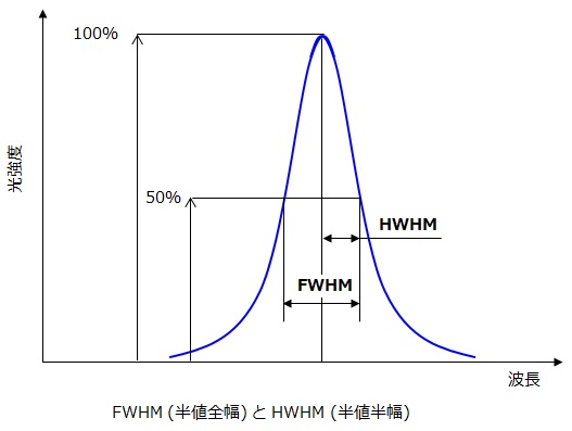 ■FWHM (Full Width at Half Maximum:半値全幅)スペクトルの広がりを表すのに用いられます。FWHMは強度が50%の部分のスペクトル幅です。 HWHMはFWHMの1/2になります。