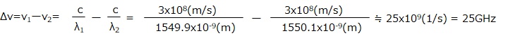 例えば、λ0=1550nm、λ1=1549.9nm、λ2=1550.1nmの場合、線幅Δλ=0.2nmですが、周波数表示では以下のようになります。cは光速です。