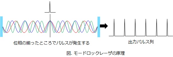 位相が一定であると各波長の山が揃ったところで干渉により光が強くなるため優先的に増幅されてパルスが発生します(図を参照)。
