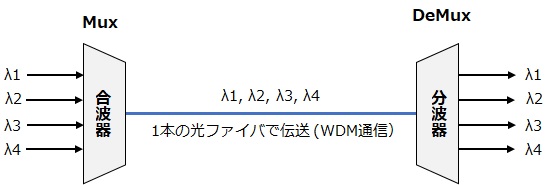は逆に合波された信号を波長別に分離するデバイスです。 複数波長の信号を1本の光ファイで伝送するWDM通信の入出力に使用されます。 CWDM通信やDWDM通信の波長に対応したデバイスが市販されています。