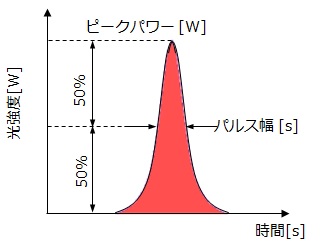 はパルスの頂点の光強度[W]、パルス幅は光強度が50%のときの時間差[s]です。 同じパルスエネルギーでもパルス幅が小さいほどピークパワーは大きくなります。