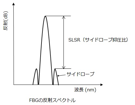 ■SLSR (Side Lobe Supression Ratio:サイドローブ抑圧比)FBG (Fiber Bragg Grating)は、光ファイバのコアに周期的な屈折率変化をつけた回折格子で、屈折率変化の周期に対応する特定の波長の光を反射します。 ところが、実際のFBGでは、反射すべき波長の両側にノイズとなる反射がみられ、これをサイドローブといいます。 SLSRは、dB表示したときの中心ピークの反射とサイドローブの差になります。 FBGの全長にわたって一様な屈折率変化である場合、原理的にサイドローブが発生します。 FBGの両端に向かって屈折率変化を徐々に小さくすること (アポダイゼーション) によって、サイドローブを抑えることができます。